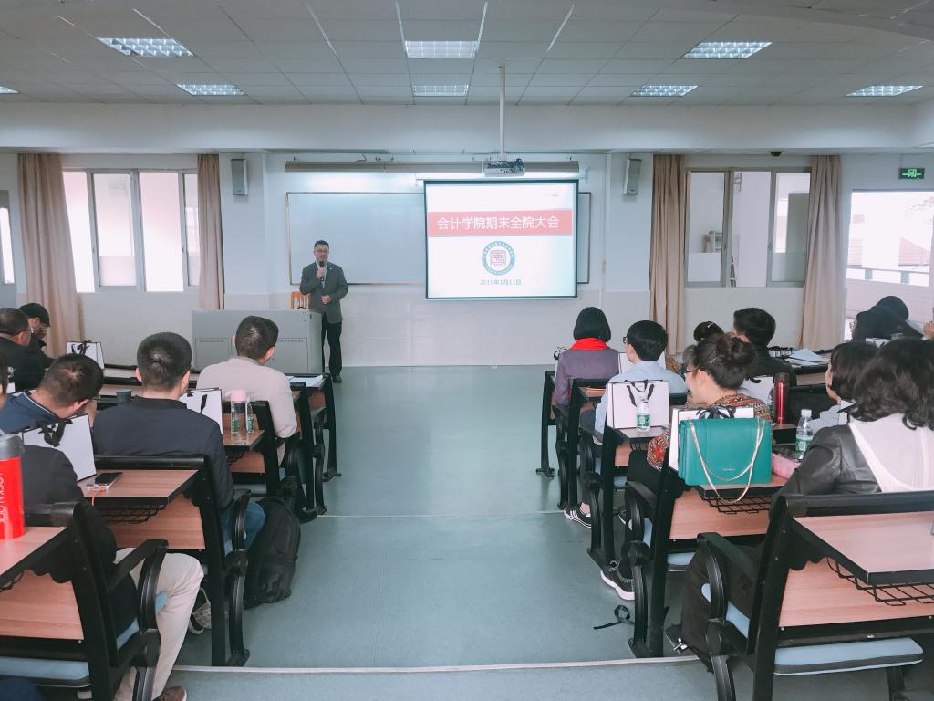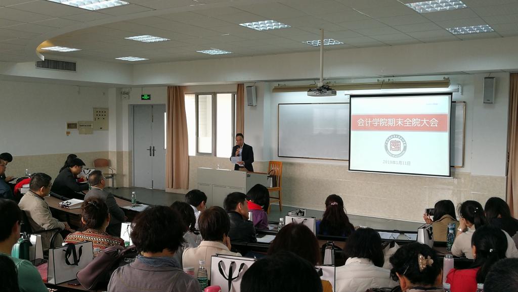 2019年1月11日下午,会计学院在南校区教学楼D312教室召开期末全院大会。大会由学院院长余鹏翼主持,全院教职工参加。