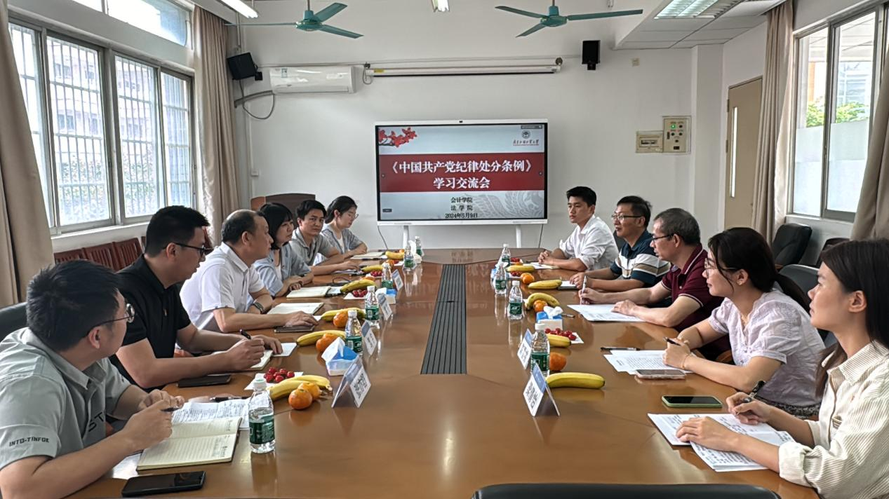 为贯彻落实全面从严治党要求,加强师生党纪学习教育,5月9日上午,法学院与会计学院在大学城校区法学院会议室联合开展了《中国共产党纪律处分条例》专题学习交流活动。会计学院党委书记黎冬、法学院党委书记杨敏生、法学院党委副书记范聪、会计学院党委副书记李海琳,以及两院组织员、辅导员等参加了交流会。