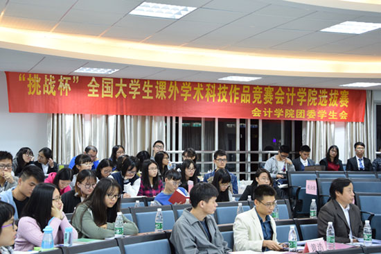19:40,2016“挑战杯”全国大学生课外学术科技作品竞赛会计学院选拔赛在南校教学楼D栋举行。本次选拔赛设有D312和D311两个会场,比赛在两个会场同时进行。受邀出席本场比赛的评委和嘉宾有政治与公共管理学院副院长毛国民教授,会计学院党委副书记黄晓梅老师、会计系系主任常亮老师、审计系系主任黄浩老师、财务管理系系主任曾昭灶老师、会计系李晓龙老师、辅导员丁建新老师。