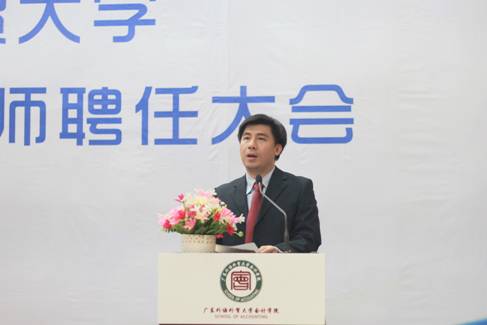 颁发聘书仪式结束后,会计学院院长刘中华发表了讲话。讲话中主要表达了三个感谢。第一,感谢校内、校外导师的到场以及业务上的支持。还指出会计实务的发展已经超越了理论的研究,并希望学院的研究生教育在未来的发展中能够做到理论和实践的深度融合。第二,感谢各位老师们对同学们的指导、参与和辛勤的付出,并希望同学们能够做到“嘴勤”、“腿勤”,与导师们多交流和沟通。第三,代表同学们对导师表达感谢。