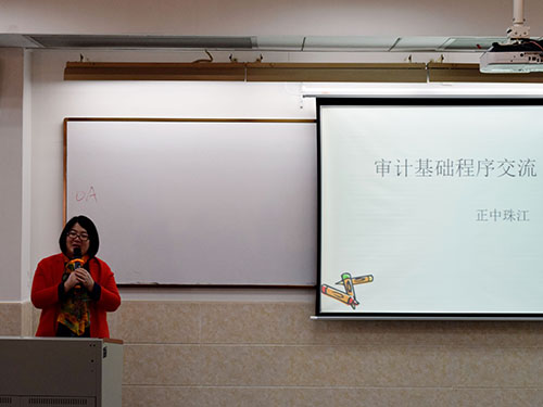 随后,正中珠江会计师事务所人力资源部的李经理对实习生们进行培训。培训主要围绕审计基础程序以及相关责任和管理制度展开。