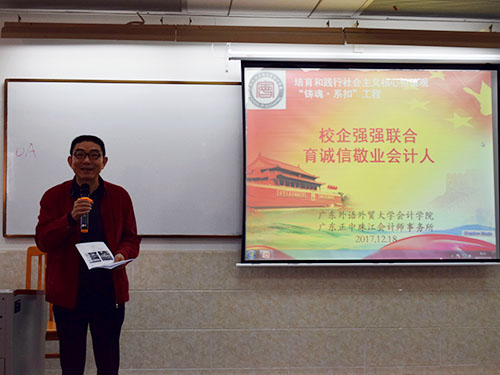 为培育和践行社会主义核心价值观,加强对诚信敬业会计人的培养,2017年12月18日,广外会计学院领导老师与正中珠江会计师事务所人员于广东外语外贸大学南校区D312课室联合开展了寒假社会实践团实习生动员大会。会计学院党委书记孙家和、副书记黄晓梅、副院长汤胜及正中珠江会计师事务所王经理、李经理出席了会议。本次大会由2015级辅导员周雅颂老师主持。