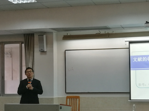 之后,常亮幽默风趣地和同学们分享关于文献收集和分析的内容。常亮首先介绍了获取文献的资源,如广外图书馆、JSTOR、Elsevier等数据库及glgoo等学术搜索引擎,也可以引用行业内知名杂志的文章,同学们可以充分利用这些资源,获取可以为论文所用的参考文献。另外,在阅读文献时应分析不同文献所研究的问题,做笔记记录自己的想法,在已有的文献中寻找创新点。