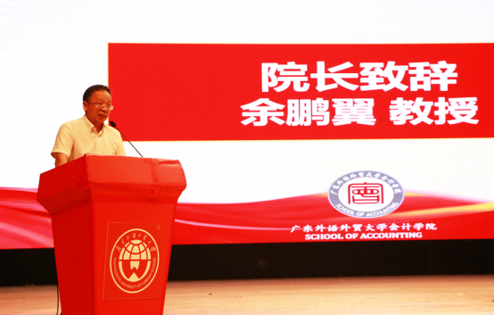 开学典礼在庄严的国歌声中拉开了序幕。院长余鹏翼在致辞中首先欢迎各位2020级新生加入会计学院大家庭。随后,他对会计学院发展历程以及近年来学院取得的成绩进行了简单介绍,多年来,会计学院始终以“培养具有国际视野的财会精英”为使命,以“构建国际化特色鲜明的高水平会计学院”为愿景,开创了“多语种+会计”的创新人才培养模式,为社会输送了许多具有国际视野的优秀财会人才。对即将开启人生新征程的2020级同学,余鹏翼院长提出了四点希望:一是希望同学们树立远大理想,胸怀报国之志;二是希望同学们勤奋好学,筑牢基础;三是希望同学们以诚信为本,践行社会主义核心价值观;四是希望同学们能够在学习生活中领悟“明德尚行,学贯中西”的校训,努力成为多技能、善沟通、会管理、有远见、敢担当,符合现代会计人才要求的社会精英,将个人的梦想与中国梦紧密结合,以梦为马,不负韶华。