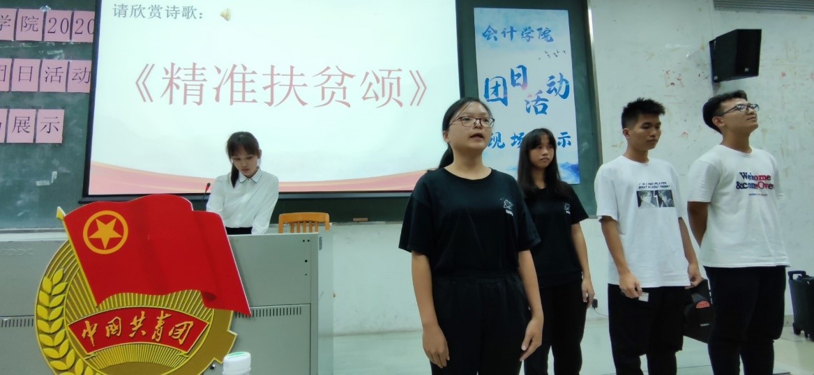 在本次展示活动中,各团支部精心准备,以视频、绘画、朗诵、情景剧等形式回顾并讲解了其团日活动的开展过程。通过展示可以看到在团日期间,同学们通过参加观影活动、举行知识竞赛、彩色包裹线下募捐、举办读书分享会、外出运动等方式学习抗疫精神、助力脱贫攻坚,同时展现出青年一代昂扬向上、奋发有为的精神风貌。杜焕君副书记对财管1902班自行组织的线上宣传募捐与线下摊宣活动表示肯定,并鼓励他们积极宣传,展示会院学子的青年担当。
