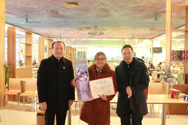 活动中院长余鹏翼、党委书记黎冬为即将退休的李国秀老师颁发荣誉证书并送上鲜花,为她兢兢业业的辛勤付出表示由衷感谢。