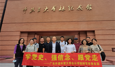 2021年10月16日上午,会计学院财务管理系教师党支部在支部书记龙文滨的带领下,立足广州本地红色资源,组织教师参观中共三大会址纪念馆和中共中央机关旧址——春园,开展“学党史、强信念、跟党走”主题党日活动,感悟党的光辉奋斗历程,领略党的百年风华,学院党委书记黎冬应邀参加了此次活动。