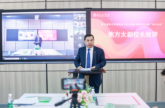 焦方太代表我校致辞,他表示广东外语外贸大学审计学专业自设立以来坚持内涵式特色发展,具有国际化、数智化、协同育人三大特色优势。此次会议请各位专家学者就审计学科发展与专业建设、粤港澳大湾区审计、审计服务国家治理研究、审计方式与技术方法创新研究等议题进行研讨,力求为学校学科发展与专业建设提供建设意见和前瞻指引。