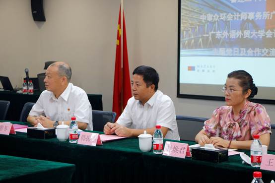 9月15日,为迎接党的二十大胜利召开,加强校企合作,广东外语外贸大学会计学院与中审众环会计师事务所广东分所联合开展主题为“校企强强联合,培根铸魂育新人”的主题党日活动及合作交流。中审众环会计师事务所广东分所所长、合伙人、经理,会计学院党委书记黎冬、党委副书记杜焕君,辅导员邹宇、李宏达和学生代表参加本次活动。