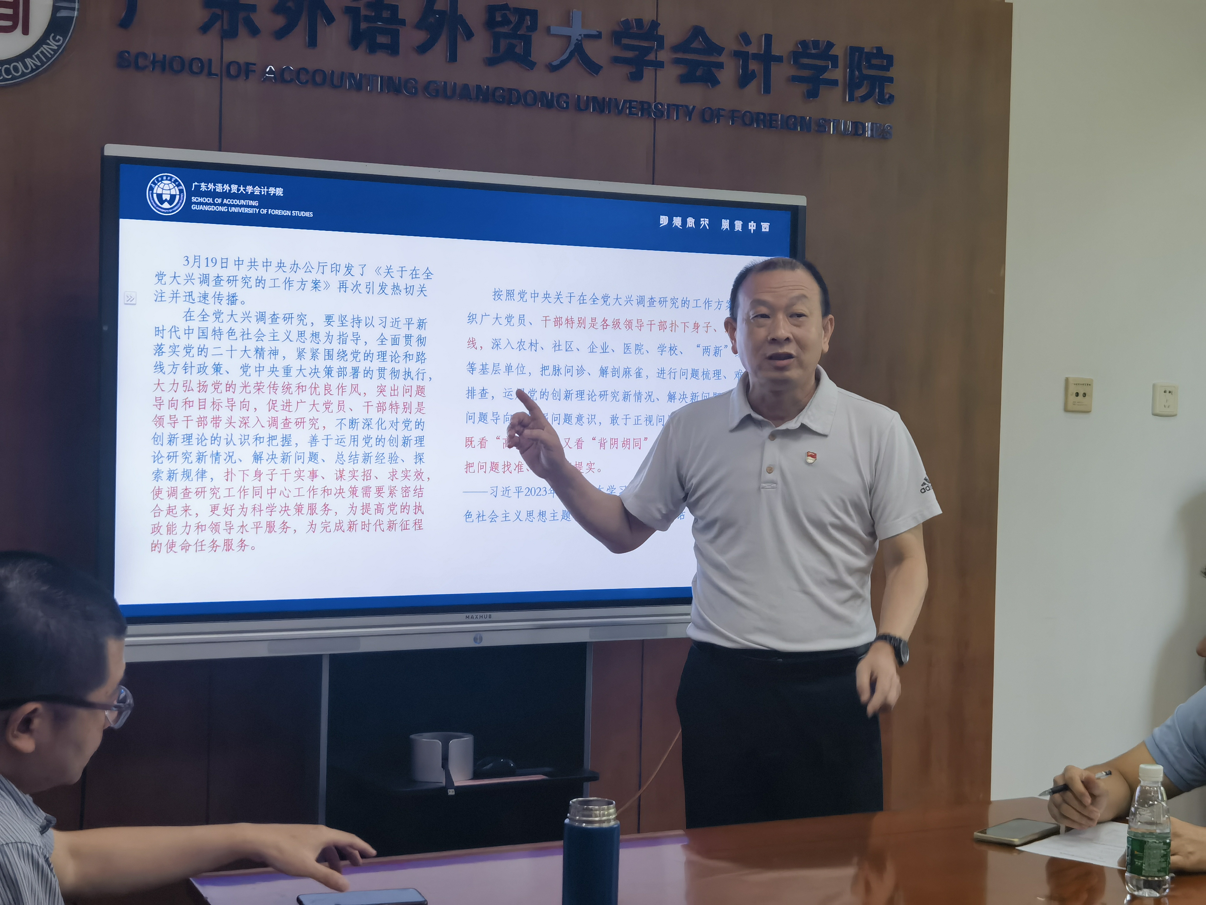 2023年6月5日,会计学院党委在院系楼101召党委理论学习中心组(扩大)学习会,深入学习领会习近平总书记关于调查研究的重要论述,学院领导、党委委员、各系部办主任、教工、学生党支部书记参会,会议由党委副书记、院长余鹏翼主持,党委书记黎冬领学。