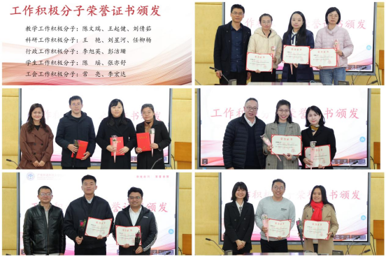 随后,学院对 2023年教学工作、科研工作、行政工作、学生工作、工会工作积极分子进行表彰,学院领导分别为获奖老师颁发荣誉证书。