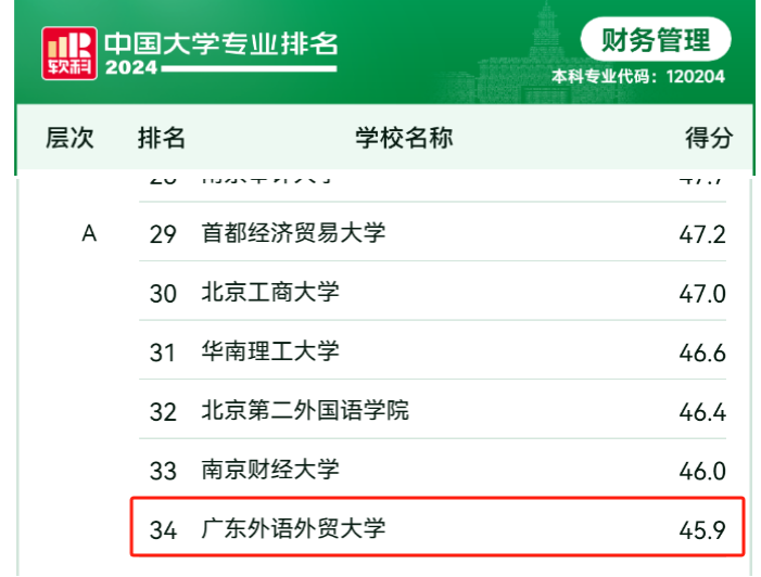 财务管理专业获得A级排名,位居全国第34位