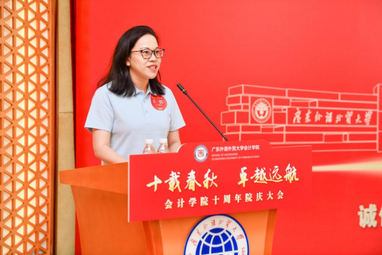 毕马威华振会计师事务所(特殊普通合伙)广州分所党委书记,分所负责人,1997级校友王洁女士作为校友代表发言,她回顾了在广外求学的美好时光,感谢学院的悉心培养和老师们谆谆教诲,也赞叹学院日新月异的发展和变化。她表示,作为会院校友,她将接续奋进,开拓创新,持续关注学院事业发展,为母院、母校的建设贡献力量。