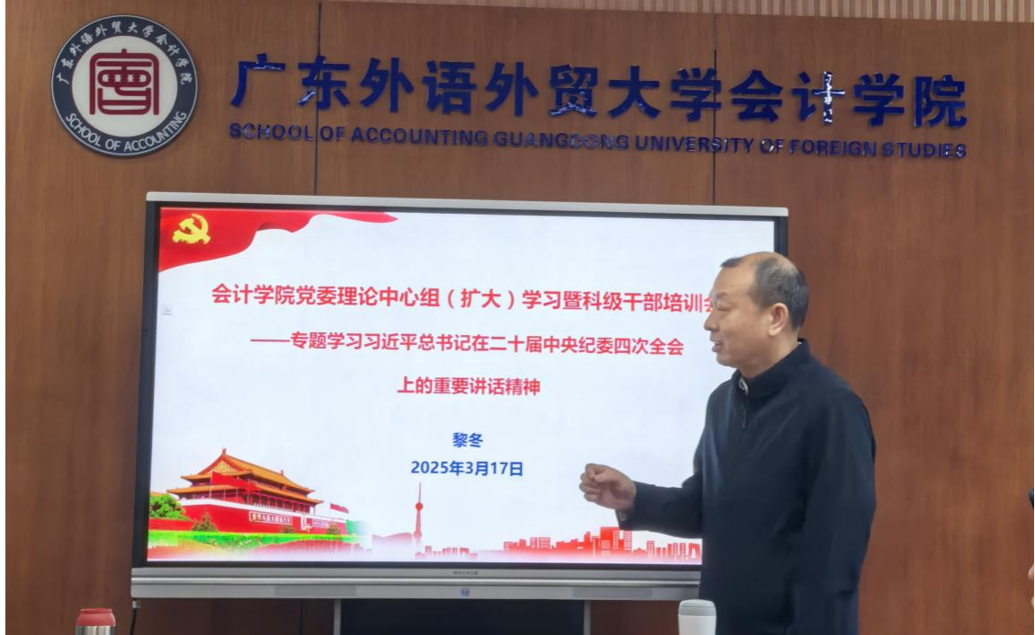 黎冬指出习近平总书记在二十届中央纪委四次全会上的重要讲话,高屋建瓴、思想深邃,为深入推进全面从严治党指明了方向、提供了遵循。全体党员干部要深刻领会讲话精神实质,以高度的政治自觉和政治担当,推动学院党风廉政建设,营造风清气正的政治生态,赋能学院各项事业的发展。黎冬书记还带领大家学习《关于印发〈广东外语外贸大学关于进一步压实学院(部)师德师风建设主体责任的实施方案〉的通知》。他指出会计学院始终以习近平新时代中国特色社会主义思想为指导,紧紧围绕立德树人根本任务,把师德师风作为评价教师队伍素质的第一标准,将社会主义核心价值观贯穿师德师风建设全过程,建立健全体制机制,强化细化日常督导,把师德师风建设摆在教师队伍建设的首位。