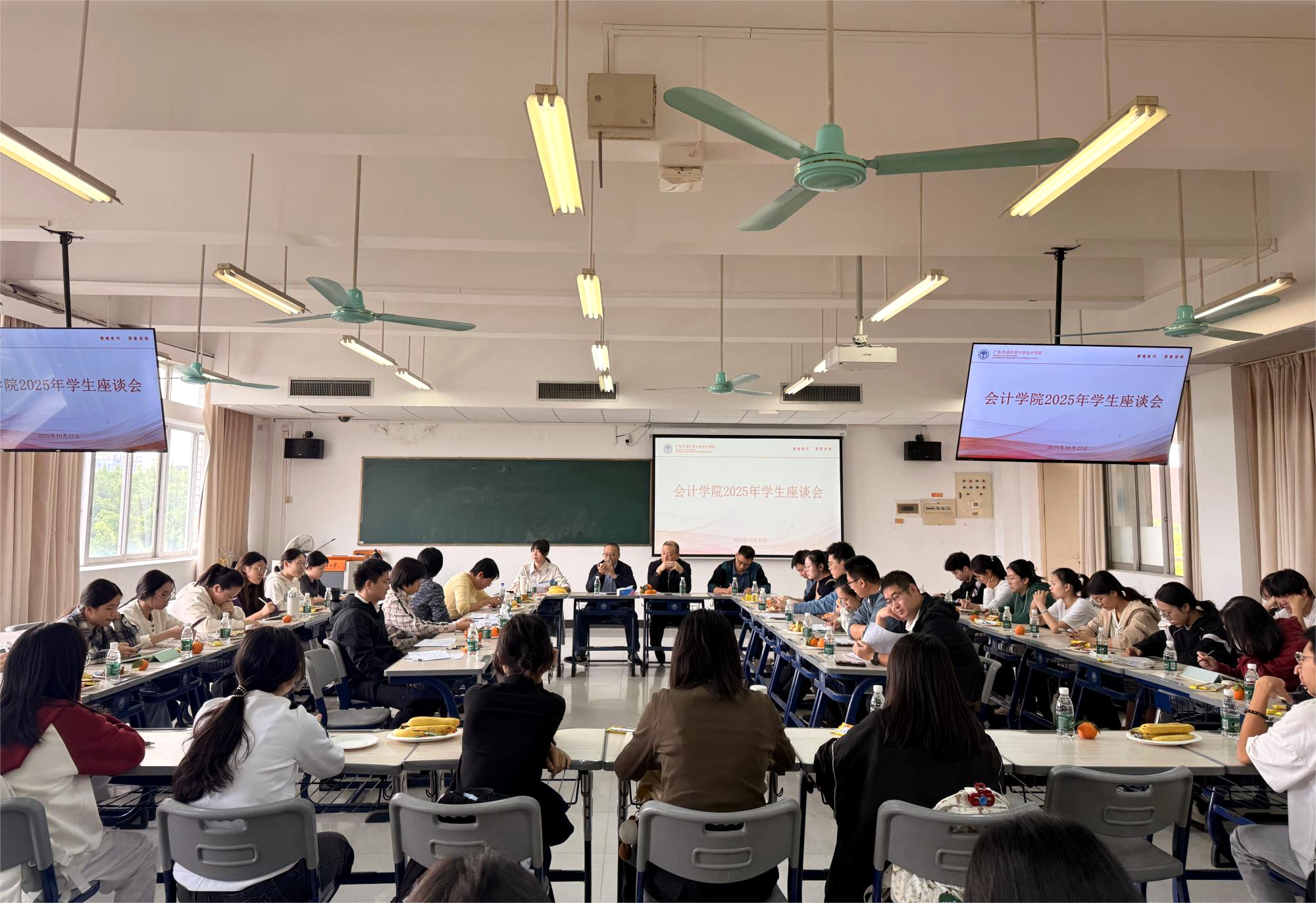 为促进学生的全面发展进一步提高教学质量,2025年10月23日下午,会计学院学生座谈会在南教学楼D410顺利举行。会计学院党委书记黎冬、院长余鹏翼、党委副书记李海琳、副院长黄浩、会计系主任曹瑜强、审计系主任刘倩茹、财务管理系主任许红梅,以及全体辅导员、教务办老师与各班级的学生代表共同参会。