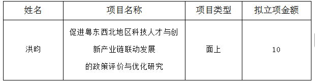 近日,广东省科技厅正式公布2026年省科技创新战略专项资金(省软科学)项目评审结果。我院洪昀老师主持申报的《促进粤东西北地区科技人才与创新产业链联动发展的政策评价与优化研究》成功获批面上项目,拟立项经费10万元。