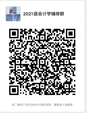 2021年辅修专业学生(主修为2020级)的课程将于9月12日开始上课(详见附件3)。请拟录取同学扫描以下二维码加入2021级会计学辅修群,后续事宜将通过微信群通知。