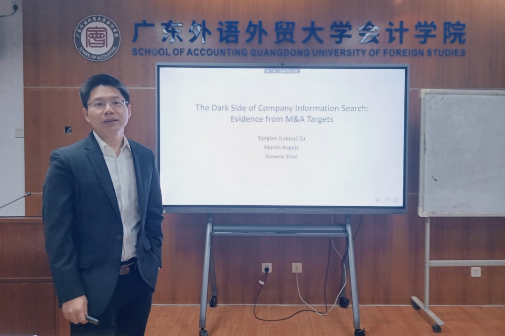 本次著名学者论坛由会计学院曹瑜强副教授主持,邀请单耀文教授作为主讲嘉宾,带来题为“The Dark Side of Company Information Search: Evidence from M&A Targets”的论文分享。单耀文教授是悉尼科技大学商学院会计学系教授,现担任国际期刊《Australian Accounting Review》(SSCI)联席主编,《Accounting and Finance》(SSCI)、《Australian Journal of Management》(SSCI)副主编,澳大利亚及新西兰会计与金融协会董事,澳大利亚资深注册会计师(FCPA)。单教授的主要研究方向为资本市场研究,会计选择与披露,公司治理,管理层薪酬等,在高水平国际期刊上发表学术论文30余篇。