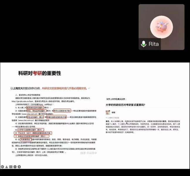再而,在第三板块中,Rita老师结合各大高校升学实例和网络资料向同学们一一介绍科研对升学,特别是关于考研、保研、留学的关键作用。分析科研对研究生复试的加分作用、对保研的冲刺作用与对留学申请的推动作用,强调各位有相关规划的同学抓紧时间完善个人未来规划,从走进科研参与科研研究开始为自己的升学规划奠定基础。
