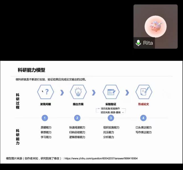 其次,在强调了解科研,走进科研的重要性后,Rita老师带领大家走进对科研定义与科研过程学习、科研能力培养的讲解板块中。老师先用如社会新闻、日常产品使用等例子帮助我们理解“科研就在身边”,再引入有关科研定义、科研过程与科研能力的学习之中,用生动的举例与类比方式帮助大家走进对科研更加深刻的理解与思考。