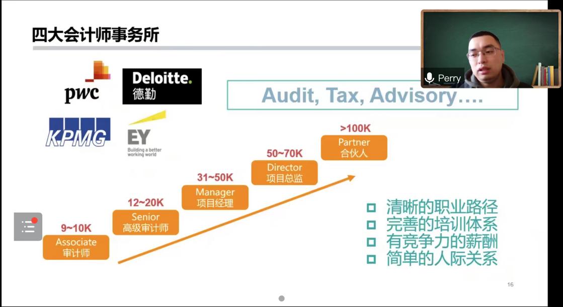 王老师为同学们剖析了四大会计师事务所的企业体系,使同学们更清楚四大会计师事务所的招聘要求、培养体系、晋升机制以及薪资待遇。