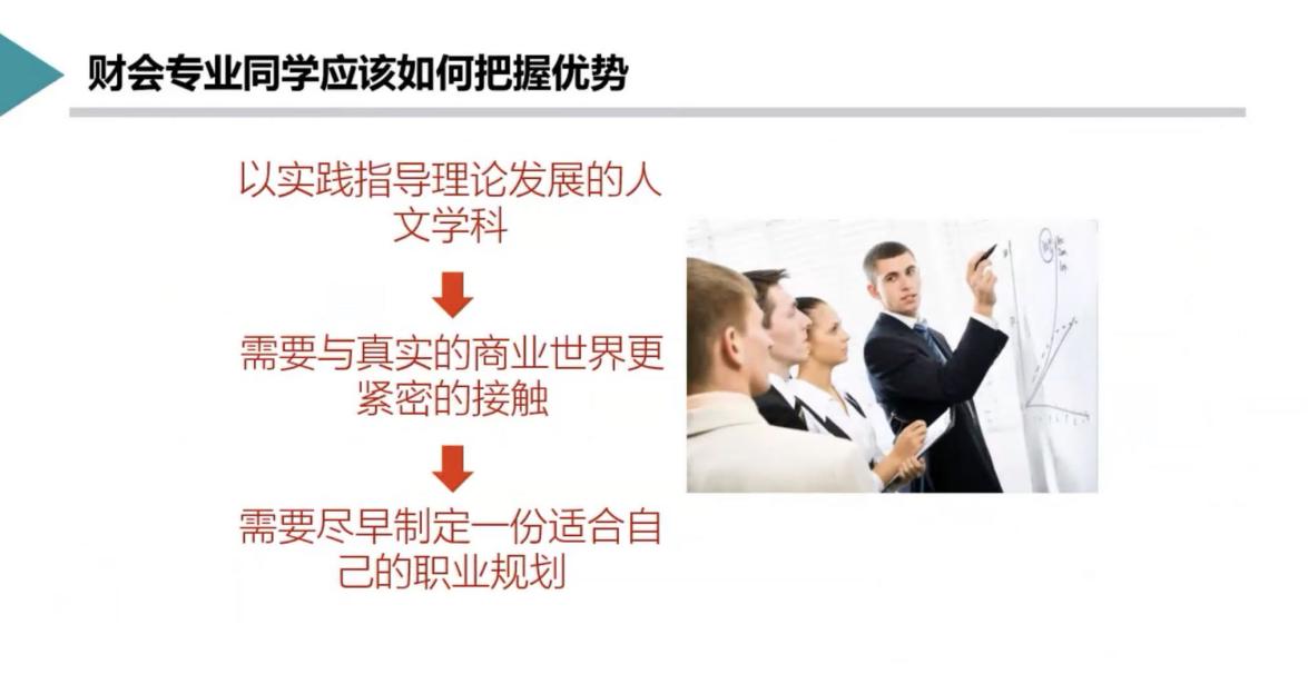 接着,王老师分析了财会行业的发展方向可以是财务会计、财务管理、审计等。并且说明了每种职业的要求、只能以及重要性。王老师重点提出财会行业注重财务分析,行业的重点发展趋势是财务共享服务以及财务PB,王老师指出目前财会行业的就业竞争越来越激烈。