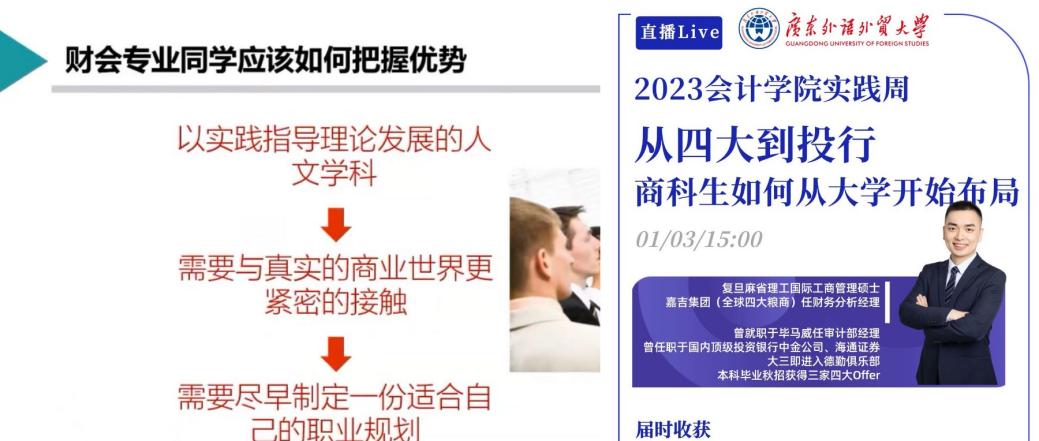 王老师就1、数智化时代下,会计师未来的职业转变;2、从四大到投行,财会学子如何跨越专业横亘,通过四大步步步为营?3、复合型人才顺应时代趋势,财会学子如何在大学期间提升自身竞争力,未来跻身顶尖商圈;4、课程在线答疑四个方面为同学们开展讲座。