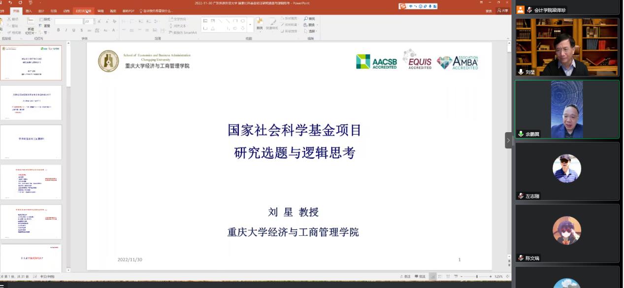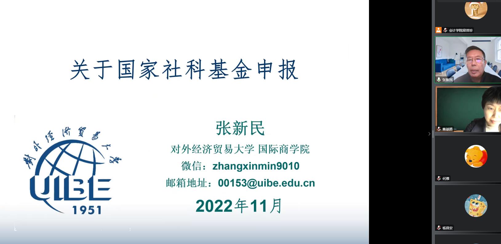 11月30日-12月1日,会计学院通过在线形式举办“会计学院商学院2023年度国家基金申报系列讲座之基金申报专家报告会”。会议邀请了重庆大学刘星教授和对外经贸大学张新民教授到会开展项目申报指导,我院有意向申报2023年度国家级项目的20余位教师参会。会议分别由会计学院余鹏翼院长、蒋基路副院长主持。