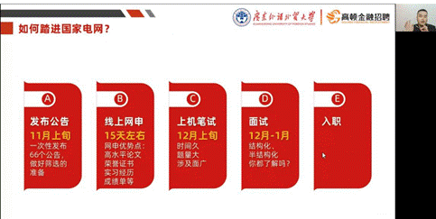 接着,黎老师以广东烟草局、国家电网两大国企为例,给同学们讲解了国企的良好待遇、招聘要求以及备战国企的方法及注意事项。