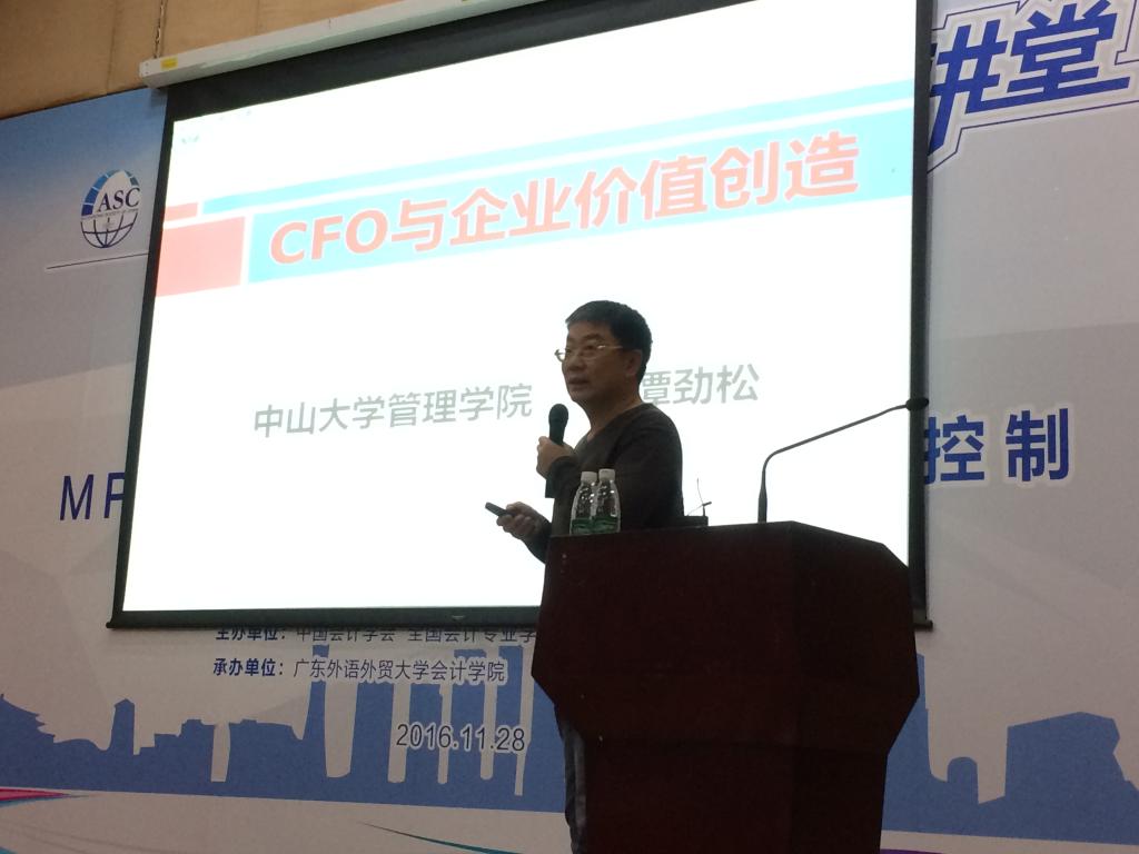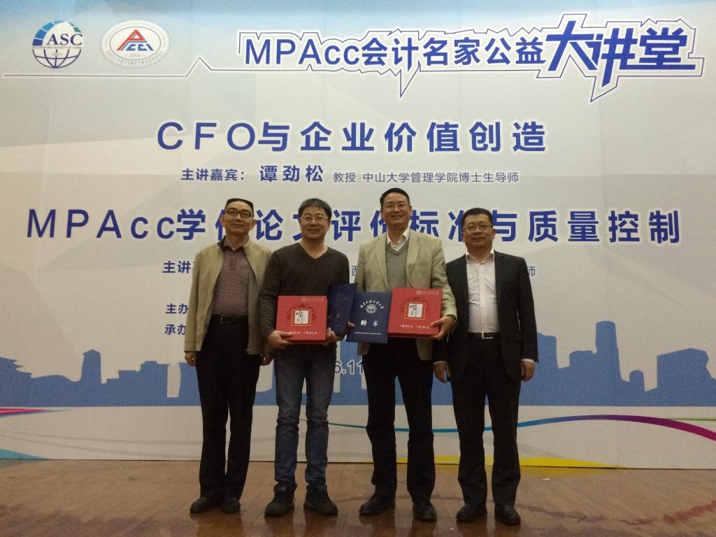 2016年11月28日上午,由中国会计学会、全国会计专业学位研究生教育指导委员会主办,广东外语外贸大学承办的MPAcc会计名家公益大讲堂首讲,在我校南校区图书馆报告厅举行,中山大学谭劲松教授和西安交通大学张俊瑞教授做客我校,为会计学院师生带来了题为“CFO与企业价值创造”和“MPAcc学位论文评价标准与质量控制”的精彩学术讲座。我院刘中华院长分别为张俊瑞教授和谭劲松教授颁发客座教授聘书,讲座由汤胜副院长主持。