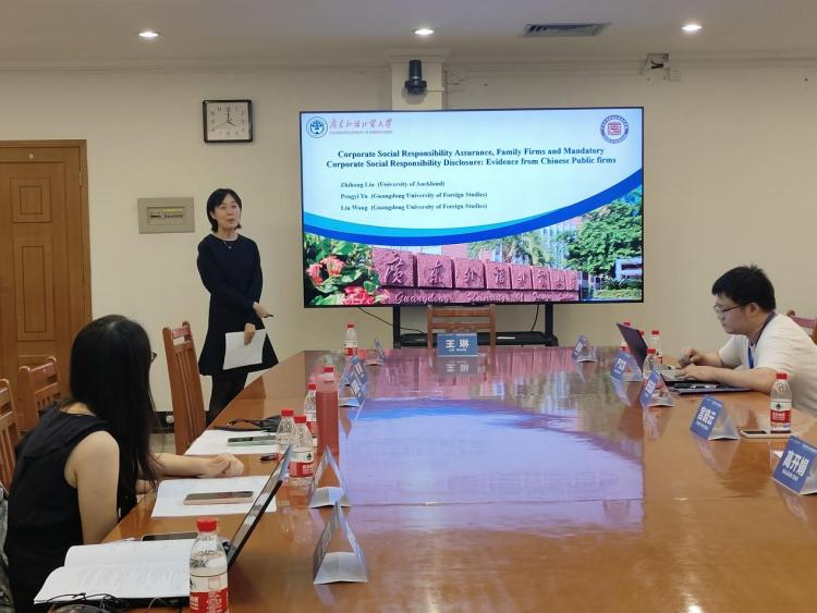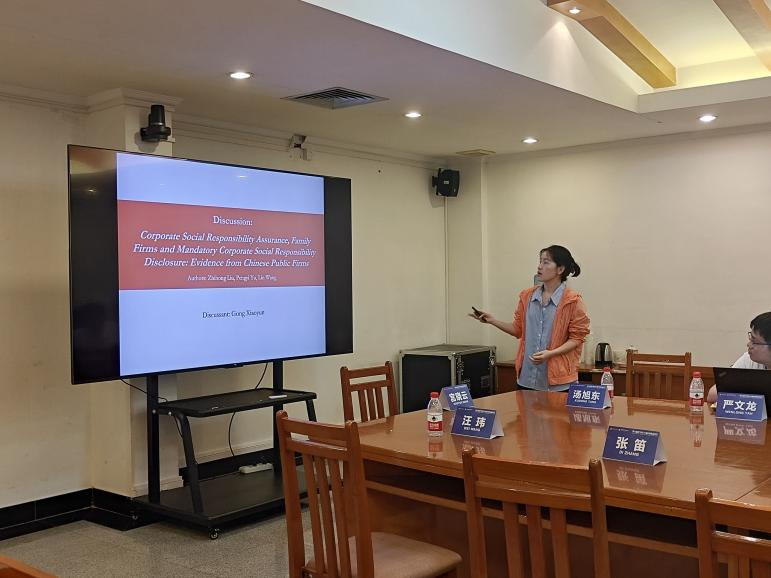 第一位汇报人是广东外语外贸大学的王琳老师,其论文题目为《Corporate Social Responsibility Assurance,Family Firms and Mandatory Corporate Social Responsibility Disclosure:Evidence from Chinese Public firms》。王琳老师首先介绍了论文研究背景,家族企业不仅在促进经济发展方面发挥重要作用,而且十分注重社会责任(CSR)履行。但利益相关者往往将企业CSR行为往往被视为公司的策略行为,因此,企业会选择第三方机构对其CSR进行鉴证以确认其CSR的可信度。由此,王琳老师引出其主要研究问题:家族企业是否倾向于进行CSR鉴证。研究发现,与非家族企业相比,家族企业不太倾向于进行CSR鉴证,进一步发现CSR强制性披露会促进家族企业CSR鉴证决策。