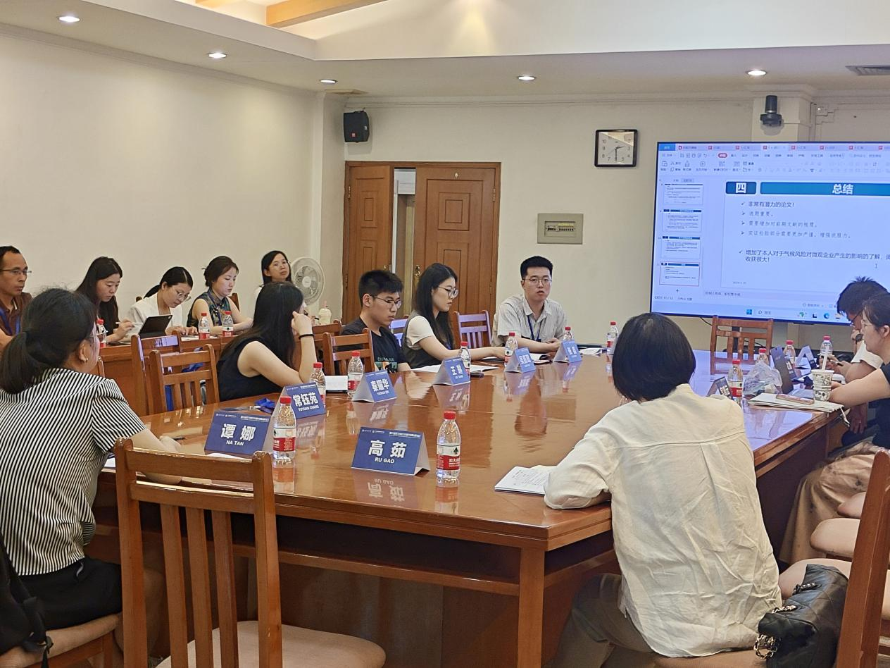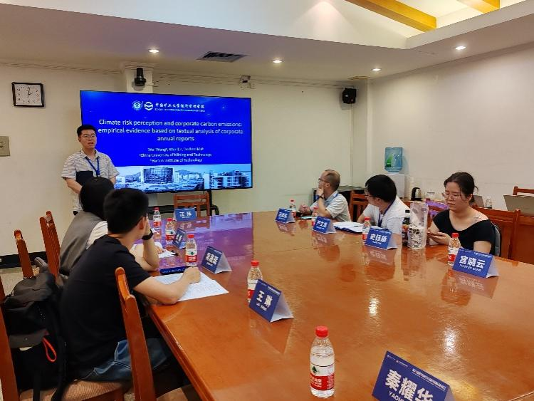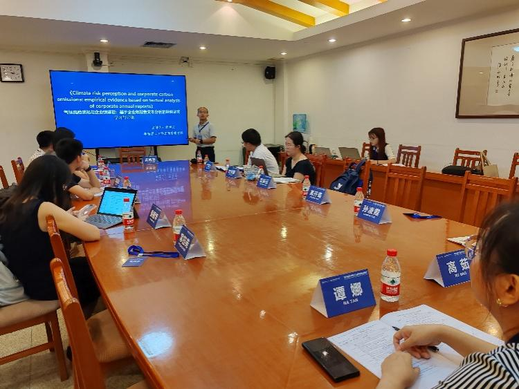 第一位汇报人是来自中国矿业大学汪玮老师,其论文题目为《Climate Risk Perception and Corporate Carbon Emissions: Empirical Evidence Based on Textual Analysis of Corporate Annual Reports》。文章聚焦于企业气候风险披露,探讨了企业气候风险感知如何影响碳排放的作用机制。为了探讨上述问题文章将气候风险引入到企业层面,使用文本分析和机器学习来确定中国的气候风险词典,并测量企业对气候风险的感知水平。其研究发现,企业感知到的气候风险会降低企业价值,碳排放会缓解气候风险对企业价值的削弱作用。文章研究结论支持碳排放反弹效应,这与气候风险促进绿色转型的观点相对立,丰富了碳排放领域经典管理理论的文献。
