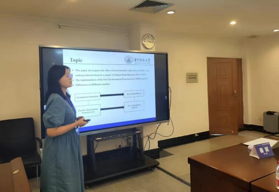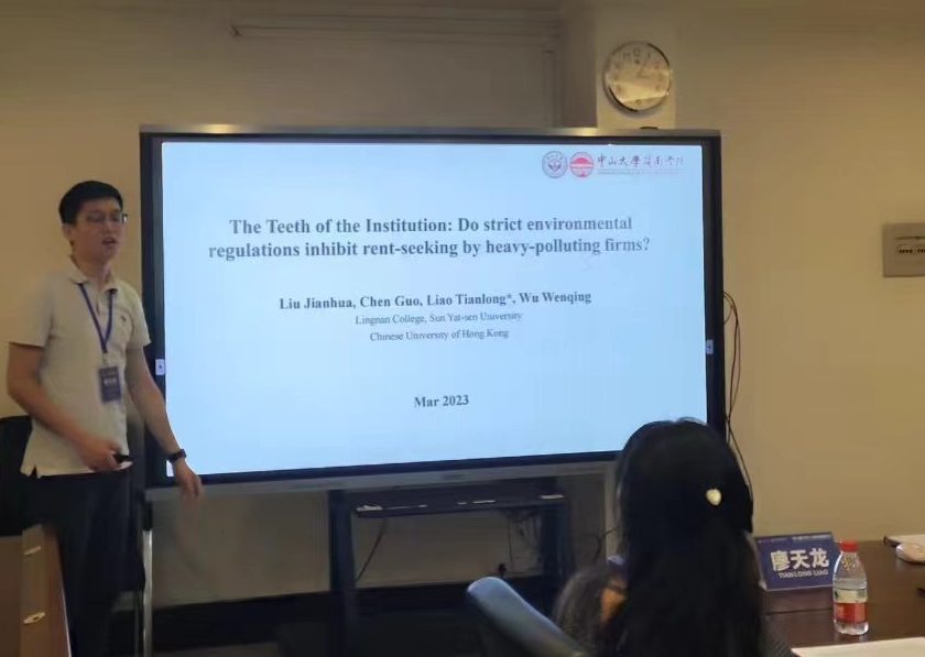 第三位汇报人是中山大学的廖天龙学者,其论文题目为《The Teeth of the Institution: Do Strict Environmental Regulations Inhibit Rent-seeking by Heavy-polluting Firms》。文章主要探讨了如何通过加强法律制度来切断寻租行为链条,以缓解环境保护和经济发展之间的矛盾,实现可持续经济发展。研究发现,在缺乏正式制度约束的情况下,地方政府会放松环境监管,导致环境污染和寻租行为盛行。此外,环保法规的执行不力也削弱了政府和企业在环境保护方面的积极动机,使得环境政策难以有效实施。因此,加强法律制度来切断寻租链是缓解环境保护和经济发展之间矛盾、实现经济可持续发展的关键。
