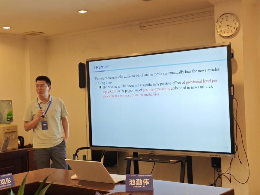 第三位汇报人是广东外语外贸大学的常亮学者,其论文题目为《Judging a Book by Its Cover: Analyzing Regional Media Bias through Eleven Million Online News of Listed Firms in China》。该学者从研究问题、研究意义、研究内容、指标衡量、结论和贡献等方面展开汇报。具体而言,学者指出媒体在信息披露中发挥重要作用,但受认知限制和社会规范产生的外部压力影响,媒体可能会无意中表现出区域差异的刻板表征,形成媒体地域偏见。由此,文章主要结合中国在经济发展不均衡的背景,探讨经济发展水平差异与媒体报道积极情绪之间关系。为检验其研究问题,文章选取2001—2019年中国上市公司相关的1100多万篇在线新闻文章进行文本分析,研究发现在经济发达地区,媒体会给予公司更乐观的评价。