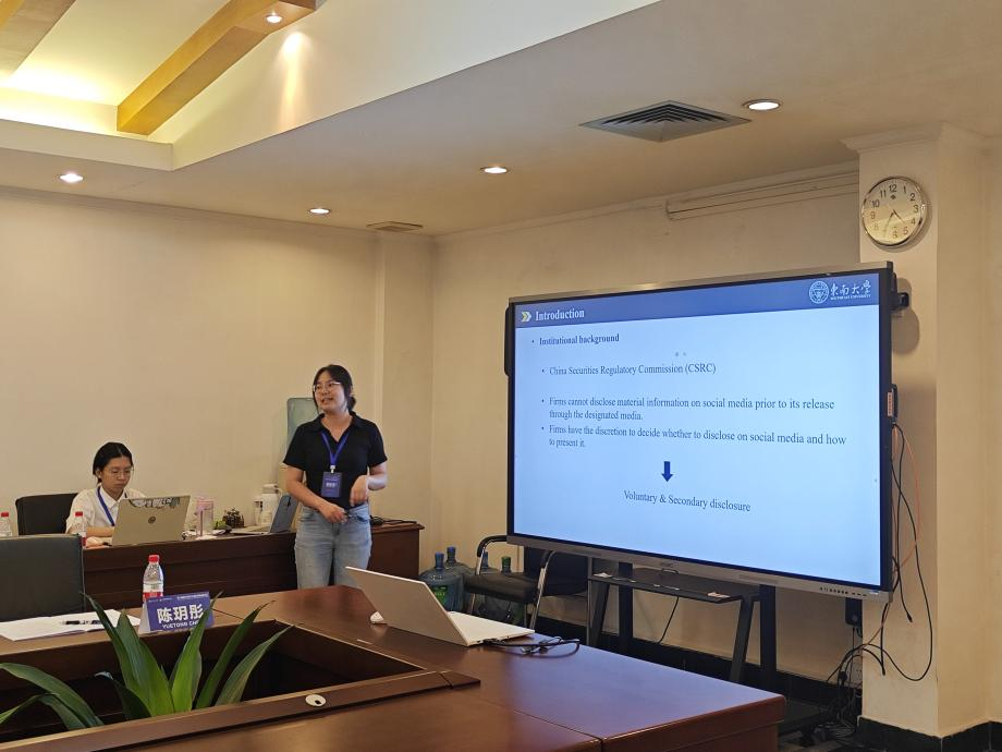 第二位汇报人是东南大学的任婕妤学者,其论文题目为《Corporate Social Media Disclosure Strategies: An Analysis from the Impression Management Perspective》。汇报围绕介绍、研究假设、研究设计、结果和结论五个部分展开。随着社交媒体的发展,企业使用社交媒体的频率不断增加。在印象管理理论中企业可以通过防御性策略和自信性策略呈现出良好的形象。基于上述现实和理论背景,文章主要探讨了中国管理者披露策略及其动因的研究问题。通过文献回顾,文章提出三个假设分别是:业绩下滑的公司倾向于在社交媒体上披露非营利信息;业绩提升的公司倾向于在社交媒体上披露净利润;业绩提升的公司倾向于在社交媒体上披露比较信息。基于此,文章利用Python等工具抓取、整理数据,使用logic模型,验证了上述假设。此外,围绕披露策略的影响因素、披露后的经济后果进一步展开研究。最后,该学者以论文的三项贡献结束本次汇报。