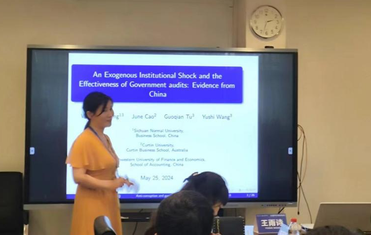 第二位汇报人是西南财经大学的王雨诗学者,其论文题目为《An Exogenous Institutional Shock and the Effectiveness of Government Audits: Evidence from China》。文章主要探讨了中国反腐运动这一外部制度冲击如何影响政府审计有效性。学者认为政府审计是政府的有效性和问责制的关键守门人,但其独立性问题一直是挑战。而中国的反腐运动是全球范围内最广泛和最深入的反腐运动之一,其力度和强度都在不断增强。在此背景下,文章探讨了反腐运动是否会影响政府审计的有效性,以及这种影响是否因地区腐败程度、政府审计强度等因素而有所不同。研究结果显示,反腐运动显著提高了政府审计的有效性,具体表现为被审计单位对审计问题的整改率提高,政府审计发现的问题得到纠正的比例增加。此外,反腐运动还通过增加政府审计的独立性、揭示更多的腐败行为、提高政府审计效率和效果,进而显著提高政府审计的有效性。此外,反腐运动还可能增加政府审计的额外成本,降低官员的权力,并提高反腐运动的强度。