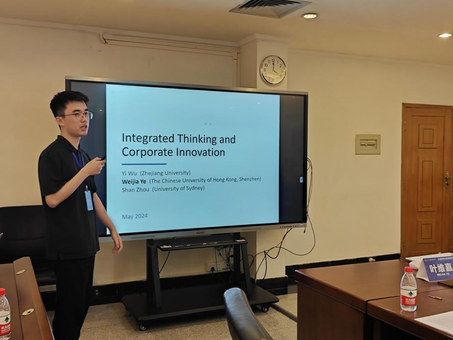 第一位汇报人是香港中文大学(深圳)的叶维嘉学者,其论文题目为《Integrated Thinking and Corporate Innovation》。叶维嘉认为创新是企业微观和宏观层面的关键驱动因素,并探讨了综合思维对公司创新的影响:综合思维导致公司管理者有更多的联合决策和行动,并考虑在短期、中期和长期内创造价值,从而有助于企业创新能力的提高。学者提出,综合思维通过三条渠道影响企业创新:整合各项信息并促进知识转移、促进公司内部的长远发展思维、培养值得信赖的企业文化。据此文章选取2008—2020年52个国家和地区33,810个“公司-年度”样本进行固定效应测度,并通过一系列稳健性检验印证结论可信度。研究发现综合思维实施能力较好的公司,其创新水平越高。且这种正相关关系对跨国公司、处在治理不善的国家或地区的公司、处在性别较不平等的国家或地区的公司更为显著。