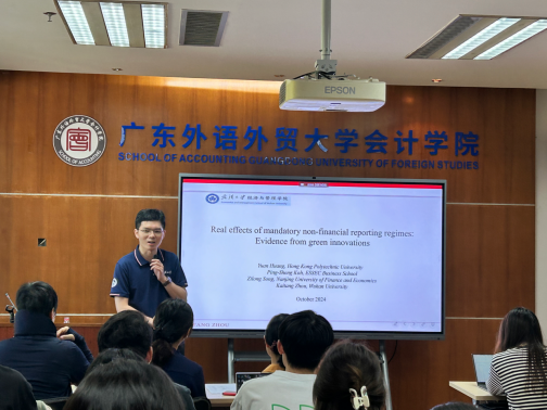 2024年10月10日下午,云山会计论坛系列学术讲座第十五期、著名学者论坛第十二期于会计学院院系楼143会议室举办。本次论坛由会计学院钟子英老师主持,邀请周楷唐副教授作为主讲嘉宾,带来题为“Real effects of mandatory non-financial reporting regimes: Evidence from green innovations”的讲座。周楷唐副教授现就职于武汉大学经济与管理学院会计系,博士生导师。研究领域为资本市场财务与会计、审计,专注于中国制度背景下的会计与审计研究。