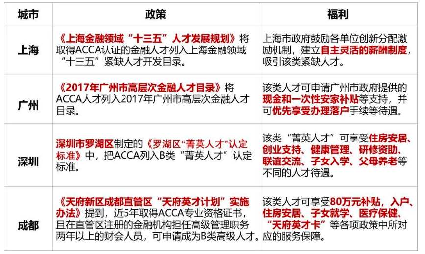 ACCA 已被北京、广州、深圳、上海、珠海等 30 个省、市列入高端财会金融紧缺人才引进 计划 ,享受落户政策、现金奖励、股权奖励、购车购房减免税等等人才福利。