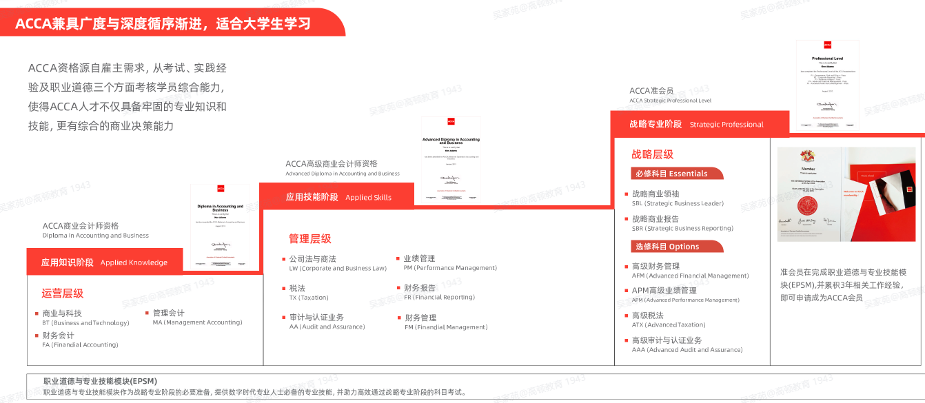 ACCA 以“经济、商业、科技 ”为导向培养会员 ,知识体系涵盖财务管理、 审计与 IPO、 税收筹划、财务报告、 战略定位与分析、投融资与估值等内容 ,是衡量商业人才的国际通