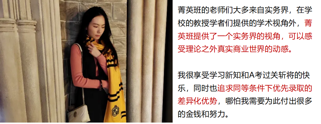 菁英班响应国家培养复合型人才的号召 ,打破专业限制 ,在学生本专业不变的前提下 ,以周 末辅修形式学习 ACCA。学生在大学期间可以同时考取含金量高的 ACCA 国际证书 ,为成为高水平的国际财经人才做好充足准备。