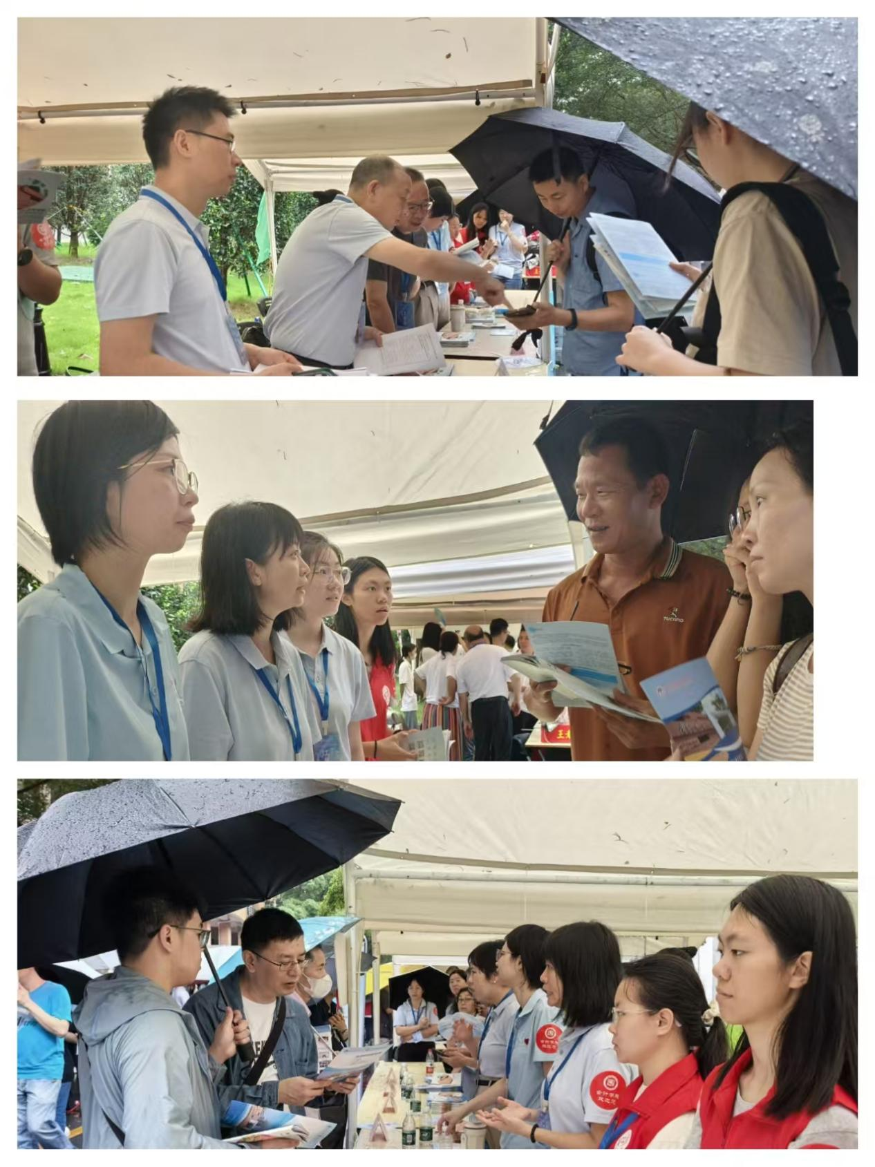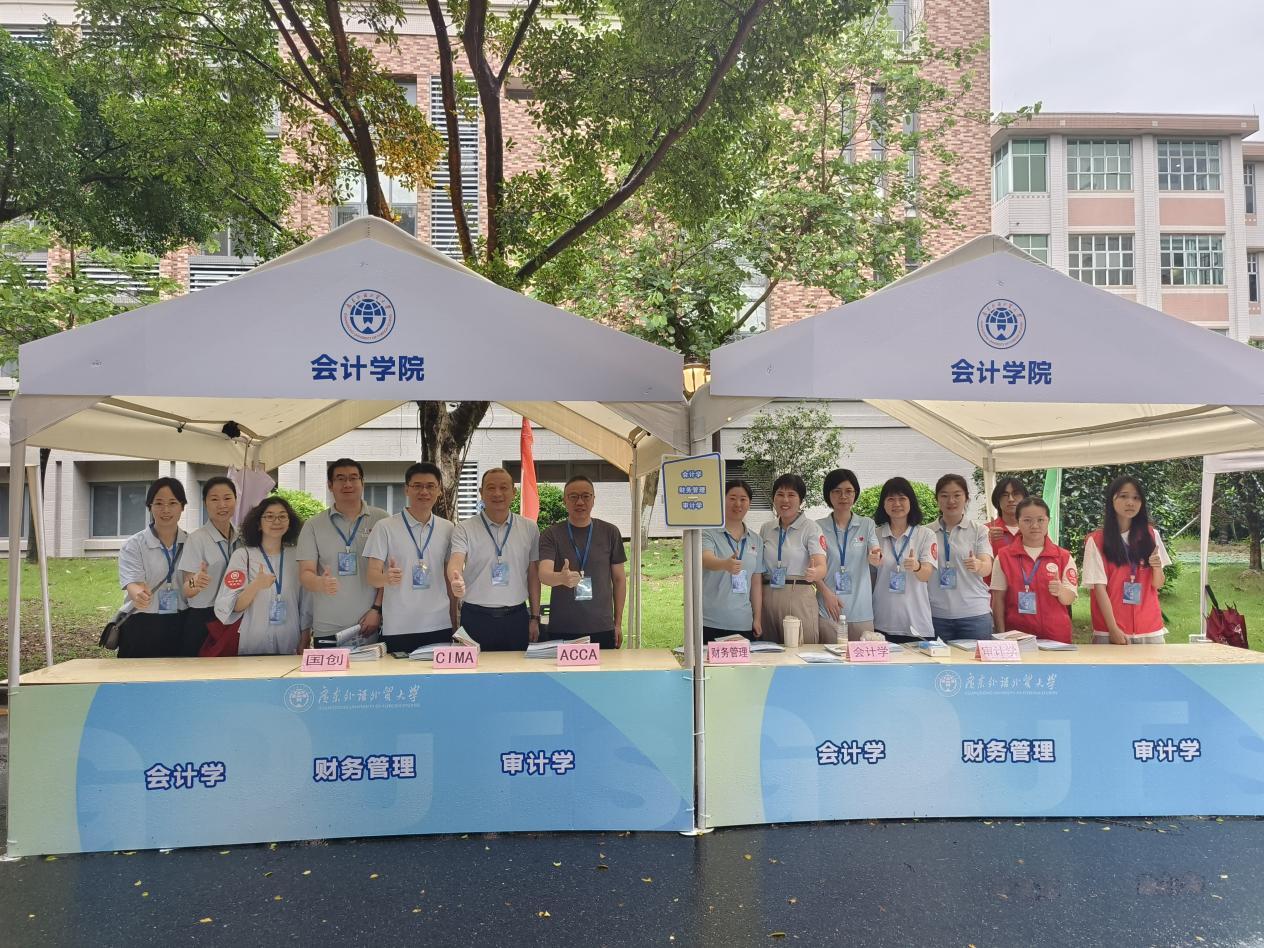 2025年6月15日,广东外语外贸大学白云山校区迎来了一年一度的大学开放日。尽管天公不作美,大雨倾盆,但会计学院的展位前依然人头攒动。气氛热烈。会计学院党委书记黎冬、院长余鹏翼、副院长黄浩、党委副书记李海琳、各专业系主任、项目主任、办公室主任等及学生代表共同参与,为前来咨询的考生和家长提供详尽的解答与贴心的服务。