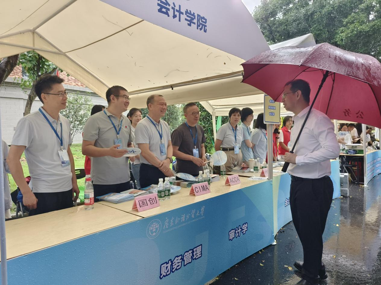 活动期间,学校副校长申明浩亲临会计学院摊位慰问,对学院开放日的组织工作和师生们的热情服务给予了充分肯定。校长的到来进一步鼓舞了团队士气,展现了学校对招生工作的高度重视。