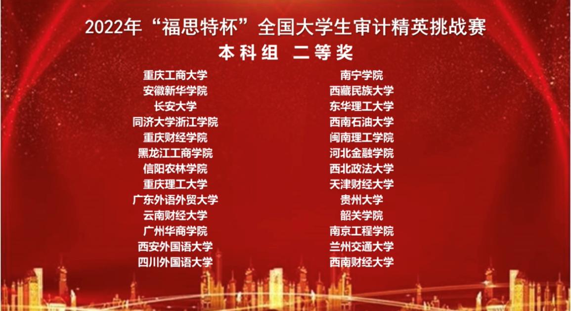 本次大学生审计精英挑战赛设在线上举行,由中国审计学会审计教育分会主办,南京审计大学承办南京审计大学承办,广州市福思特科技有限公司提供技术支持。在此次大赛中,我校与来自南京审计大学、四川大学、西南财经大学、中南财经政法大学、东北财经大学、海南大学等全国340所兄弟院校,1800余名师生同台竞技。