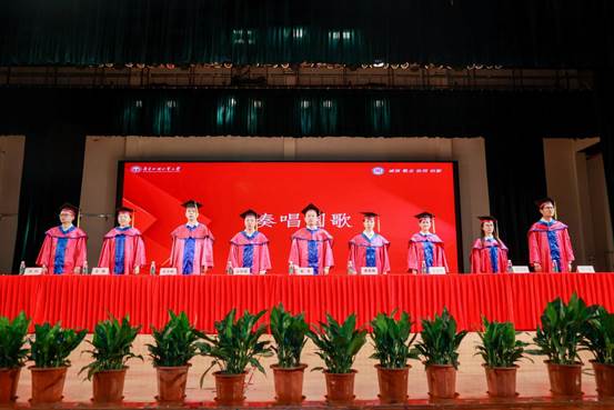 毕业典礼在雄壮的国歌声中拉开序幕,洪亮的歌声和坚定的眼光都彰显着毕业生们对祖国的浓浓爱意。