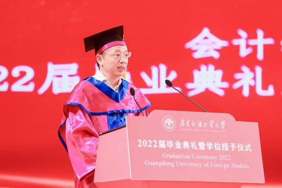 教师代表会计系洪昀副教授首先表达了对毕业生们临别前的祝福和嘱托,紧接着他总结了全体毕业生在校期间为学院的发展增光添彩的印迹。“海阔凭鱼跃,天高任鸟飞”,他殷切地祝愿所有毕业生都能在之后的新征程中开启自己的美好篇章,依然保持着对生活的热爱,保持着强健的体魄,保持着良好的心态,无论顺境还是逆境,都能无所惧,敢于挑战,展现出作为广外学子的风貌。最后他代表全体老师向同学们道别,也希望全体毕业生在各行各业发光发亮之余也还能常回母校看看。