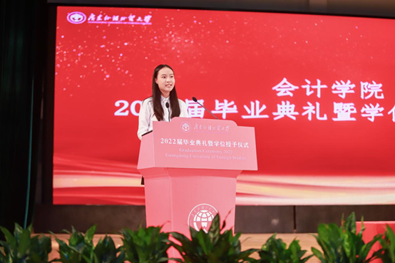 “再回首,感恩,不负遇见;向前看,远航,不忘初心。”典礼上,研究生代表徐婉敏同学回忆起这六年来在广外的点点滴滴,表达了对与广外共创辉煌的荣幸之情和对学院与老师辛勤栽培的感激之情。“青春虚度无所成,白首衔悲亦何及”,她希望大家树立终身学习的理念,拒绝诱惑,明白有所为有所不为的道理。最后,她以三句话结束发言,“破土凌云节节高,寒驱三九领风骚。”祝愿会院继续蓬勃发展,创造辉煌;“令公桃李满天下,何用堂前更种花。”祝愿各位老师桃李满园,平安喜乐;“长风破浪会有时,直挂云帆济沧海。”祝愿全体毕业生鹏程万里,不忘初心。