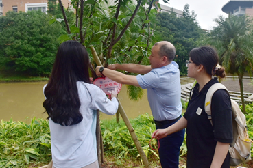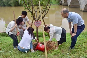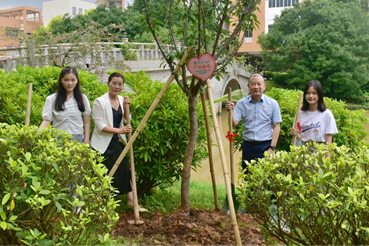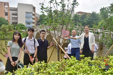 栽树完毕后,会院毕业生将代表班级的植树纪念牌小心地挂到树苗的枝头。为记录下在广外的珍贵回忆,老师和学生们纷纷在纪念树苗前合影留念。