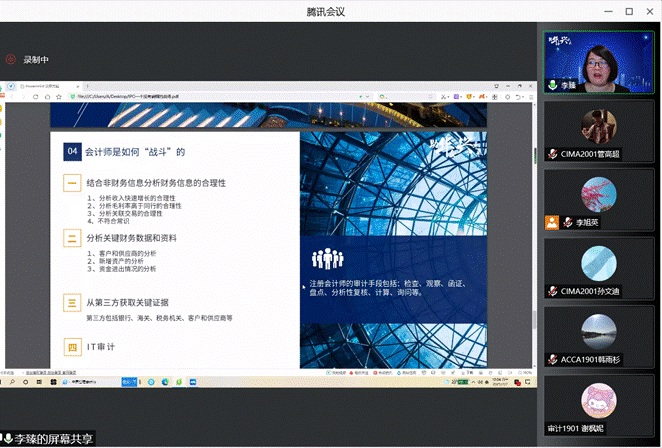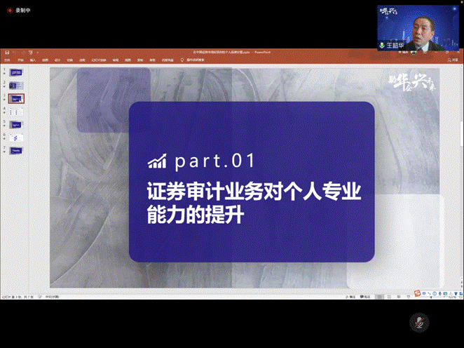 王韶华以“在中国证券市场实现你的个人品牌价值”为主题,从证券审计业务如何提升个人能力,证券市场如何实现个人价值的方式两个部分进行分享。他结合实际的案例和情境,从“会计准则、会计报表、审计准则的认识和运用”,“对各类型企业核算、财务管理的了解”,以及“如何与外界沟通”等方面,介绍了会计师在IPO审计业务中与不同对象进行证券审计业务的博弈,将对个人专业能力带来提升。他指出会计师从事IPO审计业务同时意味着以个人身份进入了证券市场,勉励有志于从事IPO行业的同学可以通过了解国内证券市场的运作,逐步建立个人在证券市场的人脉,增加个人在证券市场的曝光率,实现在证券市场上的个人价值。他还结合个人经验,分享在职场上学会如何提问,解答了事务所工作的特性,建议同学多学习会计政策。