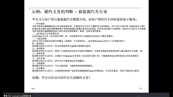 罗碧裕以“新收入准则结合行业介绍”为主题开讲。结合生动的例子介绍了“新收入准则下五步法的解读”“新收入准则的适用范围”等内容,展示了新收入准则对“新”型行业的影响。结合了新能源汽车行业实例与应用,从合同识别、履约义务等方面讲解新收入准则的变化。还介绍了“可能对交易价格产生影响的因素”“主要责任人与代理人的划分”等内容。同时,通过案例分析向我们展示了实务中准则的具体应用以及会计师应当作出的职业判断。罗碧裕指出新收入准则改革了现有的收入确认模型,构建了一个基于履约义务的单一模型,同时更加注重控制权,提供了更多的指引。